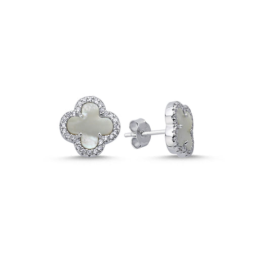 925 Sterling Silver 4 Leaf Clover Design, Mother Of Pearl and Cubic Zirconia Studs