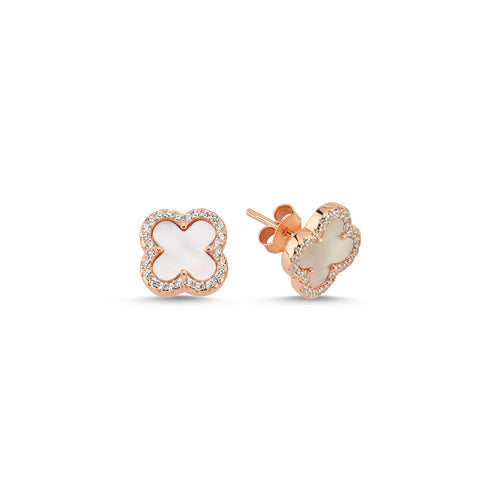 925 Sterling Silver Rose Gold Plated 4 Leaf Clover Design, Mother Of Pearl and Cubic Zirconia Studs