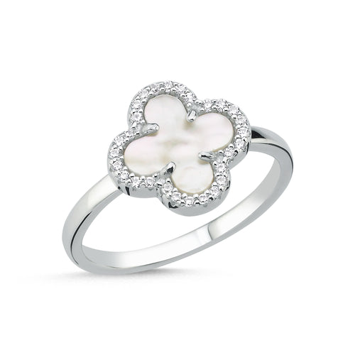• 925 Sterling Silver 4 Leaf Clover Design, Mother Of Pearl and Cubic Zirconia Ring