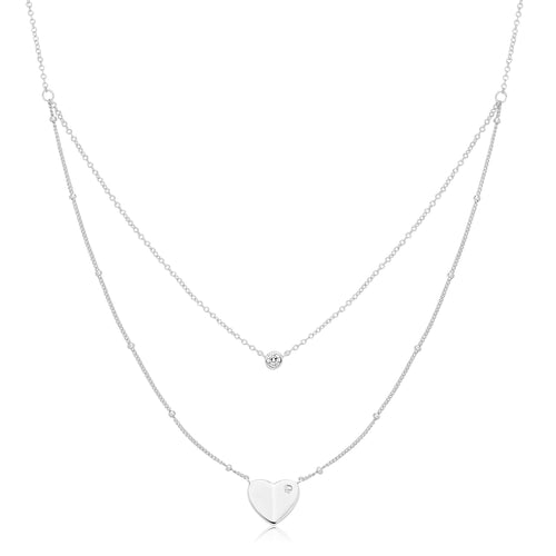 925 Sterling Silver Double Chain Heart & Single Stone Rub Over Pendant Necklace