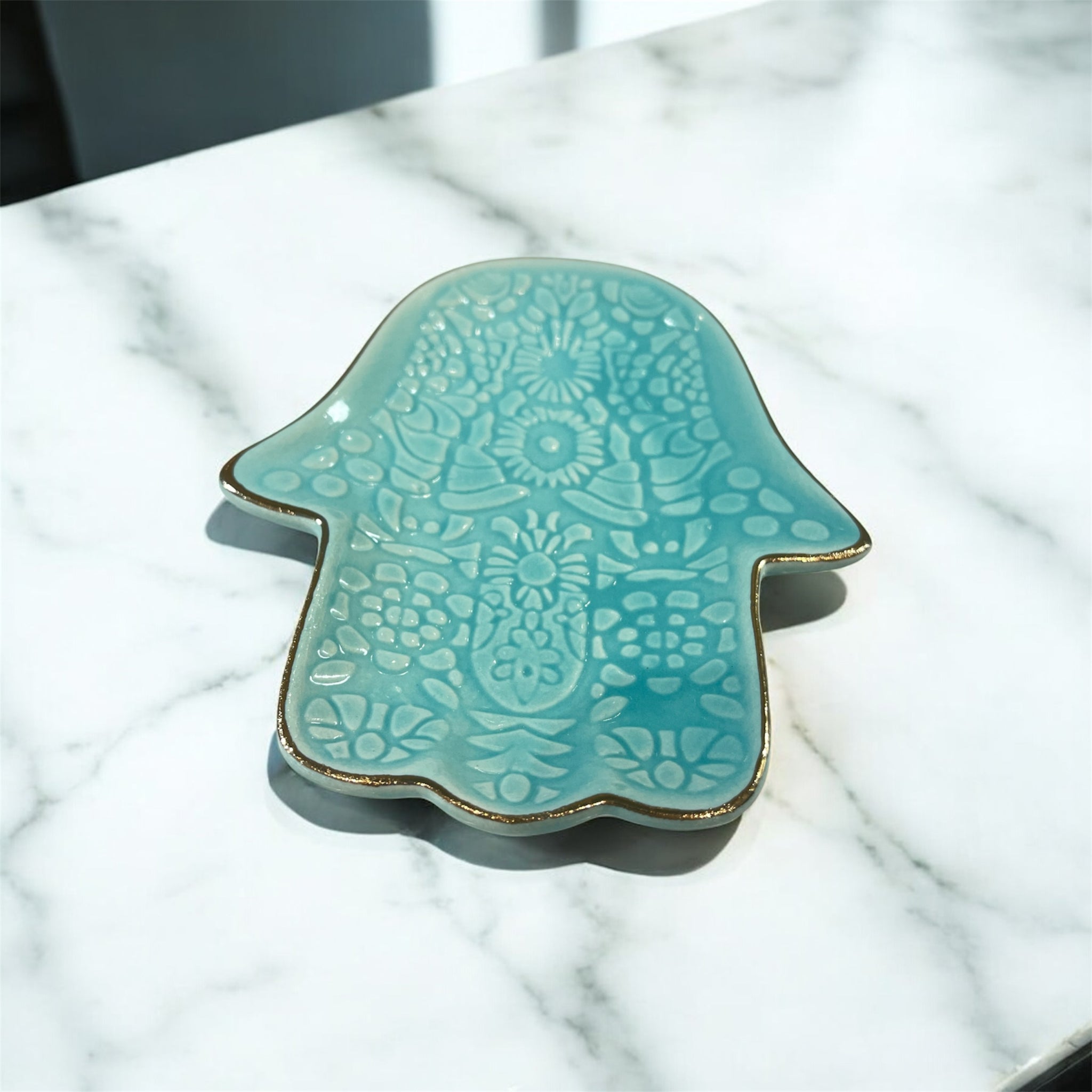 Beautiful turquoise ceramic Hamsa hand/Fatimas hand trinket dish. Amazing intricate detailing and lovely gold edging to finish off this stunning dish.