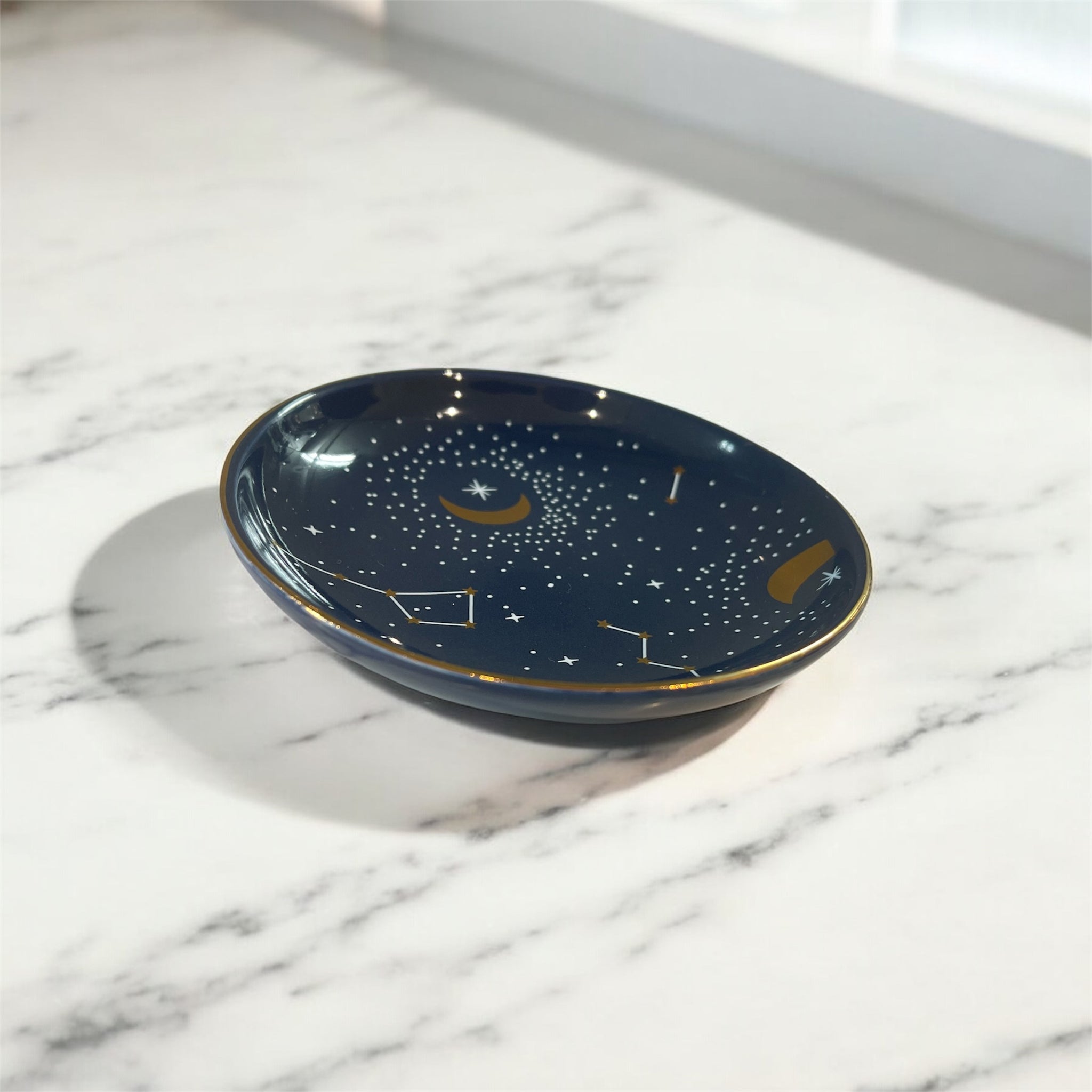 Stunning deep purple circular ceramic trinket dish, with striking interstellar design with star constellations.